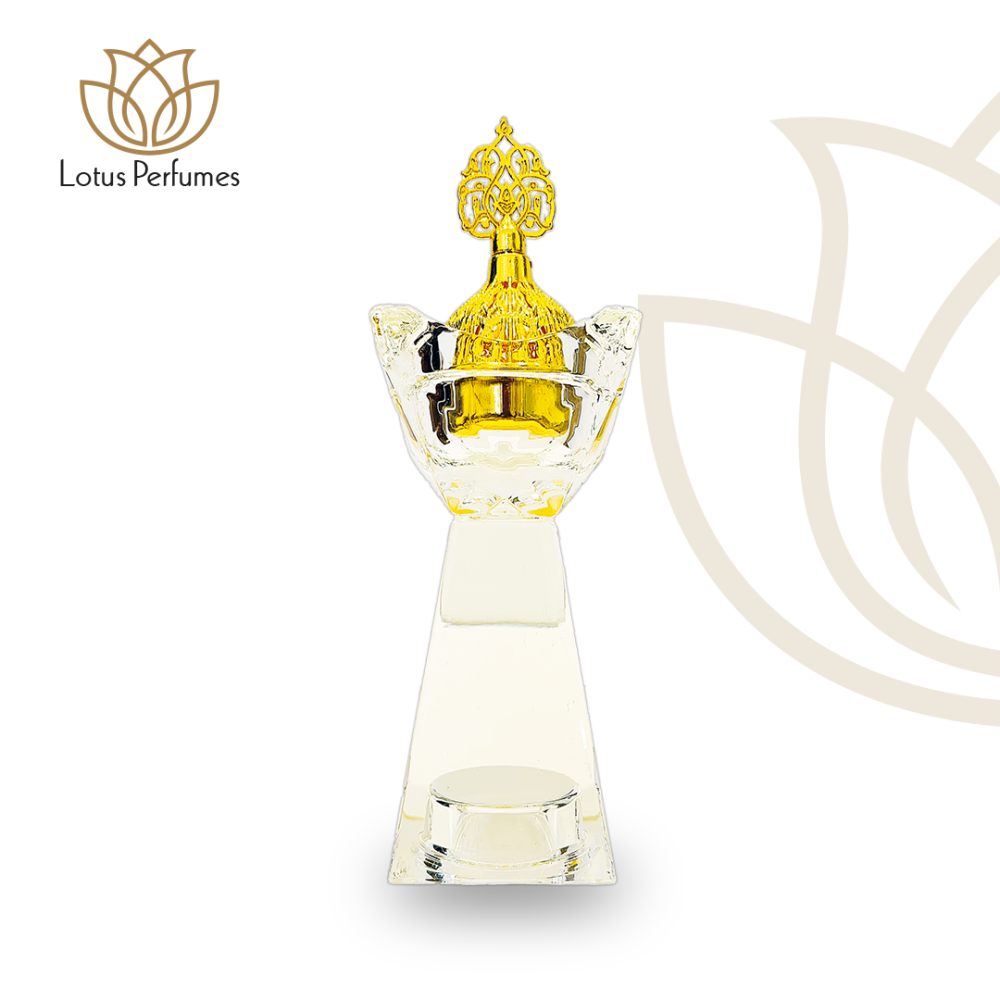 • قاعدة شفافة متينة ترتفع لتحتضن تجويفًا مزخرفًا بلمسات ذهبية براقة، تمنحها حضورًا ملكيًا يعكس روعة العود وأصالته.